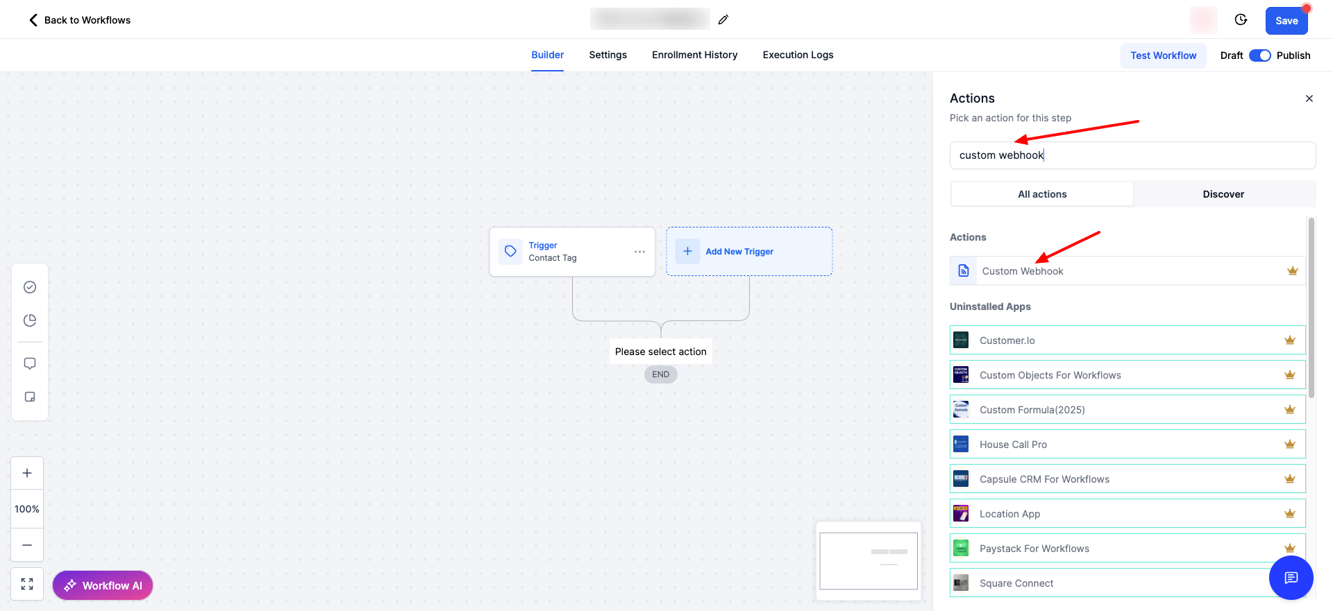 - Search for and select the Custom Webhook action.