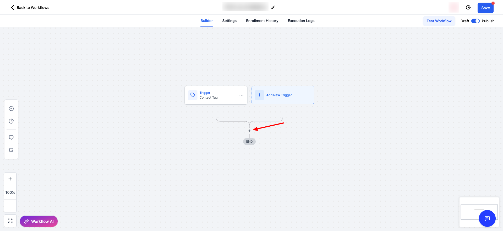 - Inside your GHL workflow, click the (+) button to add a new action.