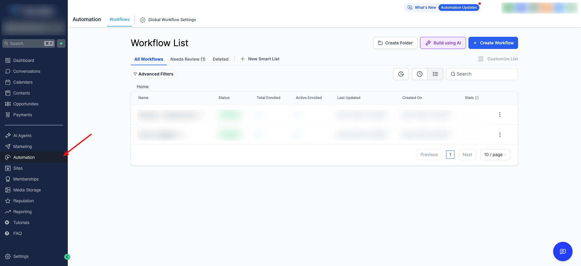 - In your GoHighLevel account, navigate to the Automation page where you will see workflows.